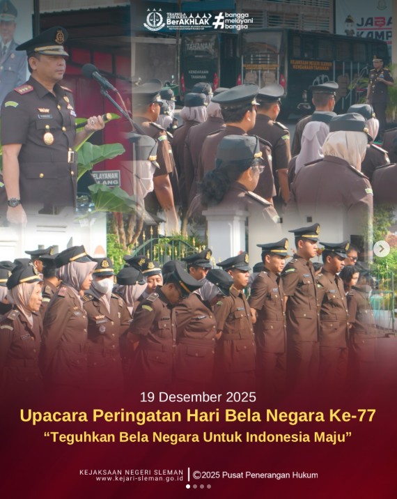 Kepala Kejaksaan Negeri Sleman Bambang Yunianto, S.H., M.H., memimpin upacara peringatan Hari Bela Negara ke-77 di Halaman Kantor Kejaksaan Negeri Sleman yang diikuti oleh seluruh pegawai. Upacara berlangsung dengan khidmat sebagai bentuk penghormatan ...