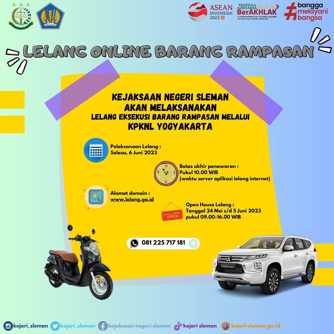 Jangan lewatkan ! Kejaksaan Negeri Sleman selaku Penjual Lelang dengan perantaraan Kantor Pelayanan Kekayaan Negara dan Lelang (KPKNL) Yogyakarta akan melaksanakan lelang Eksekusi Barang Rampasan melalui Aplikasi Lelang (lelang.go.id) terhadap objek lelang sebagai ...