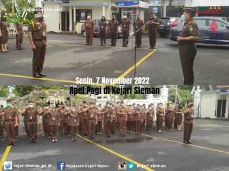 Apel Pagi pada hari Senin tanggal 7 November 2022 di kantor Kejaksaan Negeri Sleman diikuti oleh seluruh pegawai Kejaksaan Negeri Sleman. Kepala Kejaksaan Negeri Sleman Widagdo, S.H. bertindak sebagai Pembina Apel, pada kesempatannya ...
