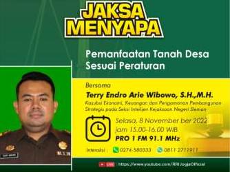 Mari kita dengarkan Siaran Dialog Interaktif Penyuluhan Hukum Program Jaksa Menyapa yang akan disiarkan melalui saluran RRI Yogyakarta FM 91,1 MHz Pro 1 pada hari Selasa, 8 November 2022 pukul 15.00 WIB s.d. ...