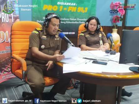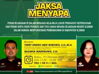 Mari kita dengarkan Siaran Dialog Interaktif Penyuluhan Hukum Program Jaksa Menyapa yang akan disiarkan melalui saluran RRI Yogyakarta FM 91,1 MHz Pro 1 pada hari Rabu, 19 Oktober 2022 pukul 15.00 WIB s.d. ...