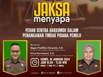 Kegiatan Siaran Dialog Interaktif Penyuluhan Hukum Program Jaksa Menyapa dengan tema “Peran Sentra Gakkumdu Dalam Penanganan Tindak Pidana Pemilu”, kerjasama dengan LPP RRI (Lembaga Penyiaran Publik Radio Republik Indonesia) Yogyakarta, yang diselenggarakan oleh ...
