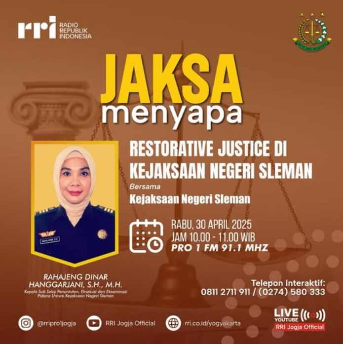 Jangan lewatkan dan mari kita dengarkan, Program Jaksa Menyapa dari Kejaksaan Negeri Sleman, hari Rabu tanggal 30 April 2025 pukul 10.00 dengan tema "Restorative Justice di Kejaksaan Negeri Sleman"! @rripro1jogja #JaksaMenyapa #Jaksa #kejarislemanmilikkita #KejatiJogja ...