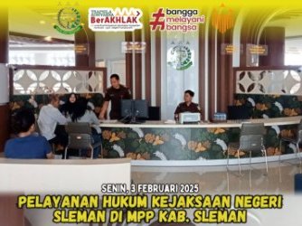 Senin, 3 Februari 2025 Stand Kejaksaan Negeri Sleman hadir di Mal Pelayanan Publik (MPP) Kabupaten Sleman untuk memberikan layanan hukum kepada masyarakat. Adapun layanan yang diberikan meliputi: Izin Besuk PB (Pembebasan Bersyarat) Absen Terdakwa SPDP ...