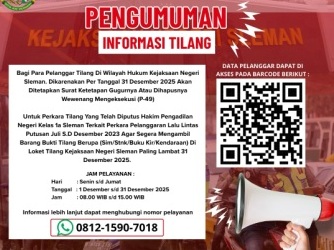 **PENGUMUMAN**Kepada para pelanggar tilang di wilayah hukum Kejaksaan Negeri Sleman, agar segera mengambil barang bukti tilang (SIM/STNK/Buku Kir/Kendaraan) atas perkara pelanggaran lalu lintas dengan putusan bulan Juli s.d. Desember 2023.Batas akhir pengambilan adalah ...
