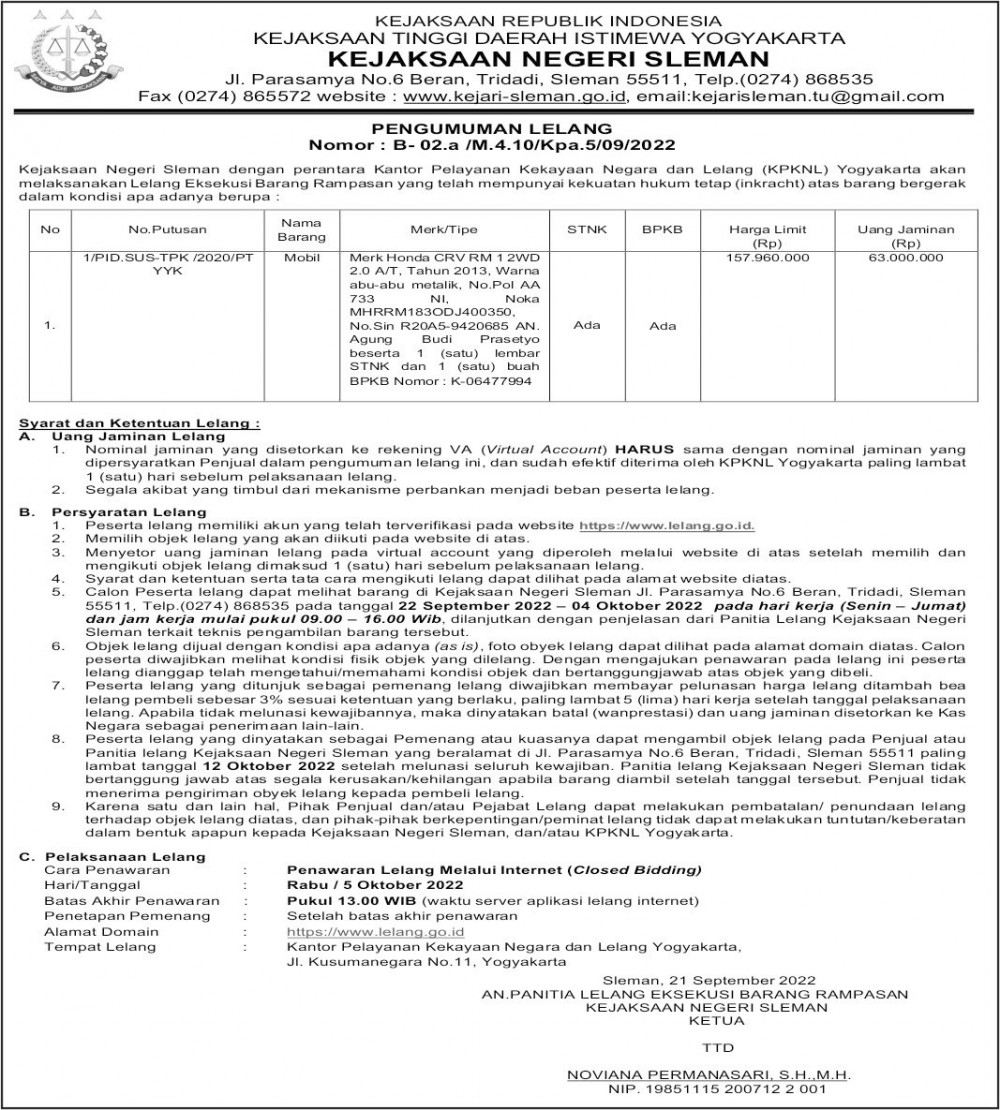 Info Lelang Barang Rampasan di Kejaksaan Negeri Sleman